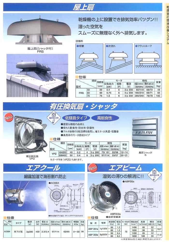 フルタ 屋上扇、有圧換気扇・シャッター、エアクール、エアビーム